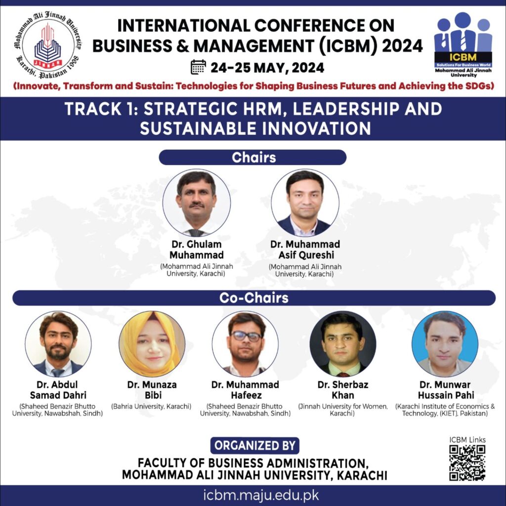 Dr. Muhammad Asif Qureshi was the Track Chair for the Strategic HRM, Leadership, and Sustainable Innovation at the International Conference on Business & Management (ICBM) 2024 organized by the Faculty of Business Administration, Mohammad Ali Jinnah University.